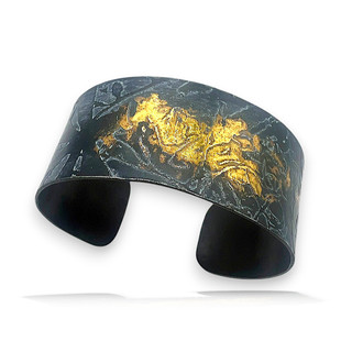Her deep dive into steel and gold fusion evolved into a distinctive body of work marked by groundbreaking methods. She perfected the adaptation of Keum Boo to steel, developed techniques to fuse powdered and alternative metals to steel, and created work with unconventional formats such as perforated sheet and woven mesh. Her radical etching techniques add further dimensionality through layered and stepped processes.